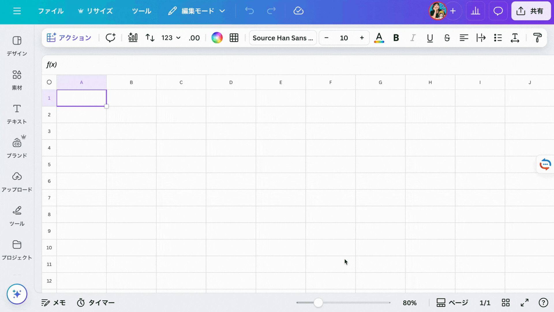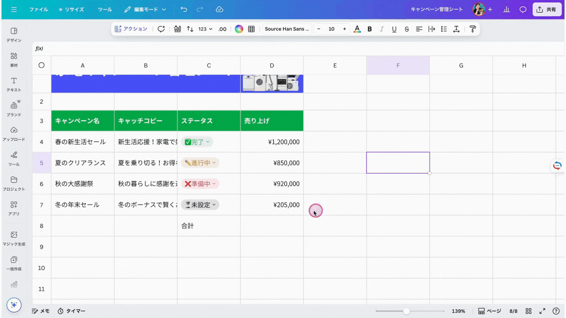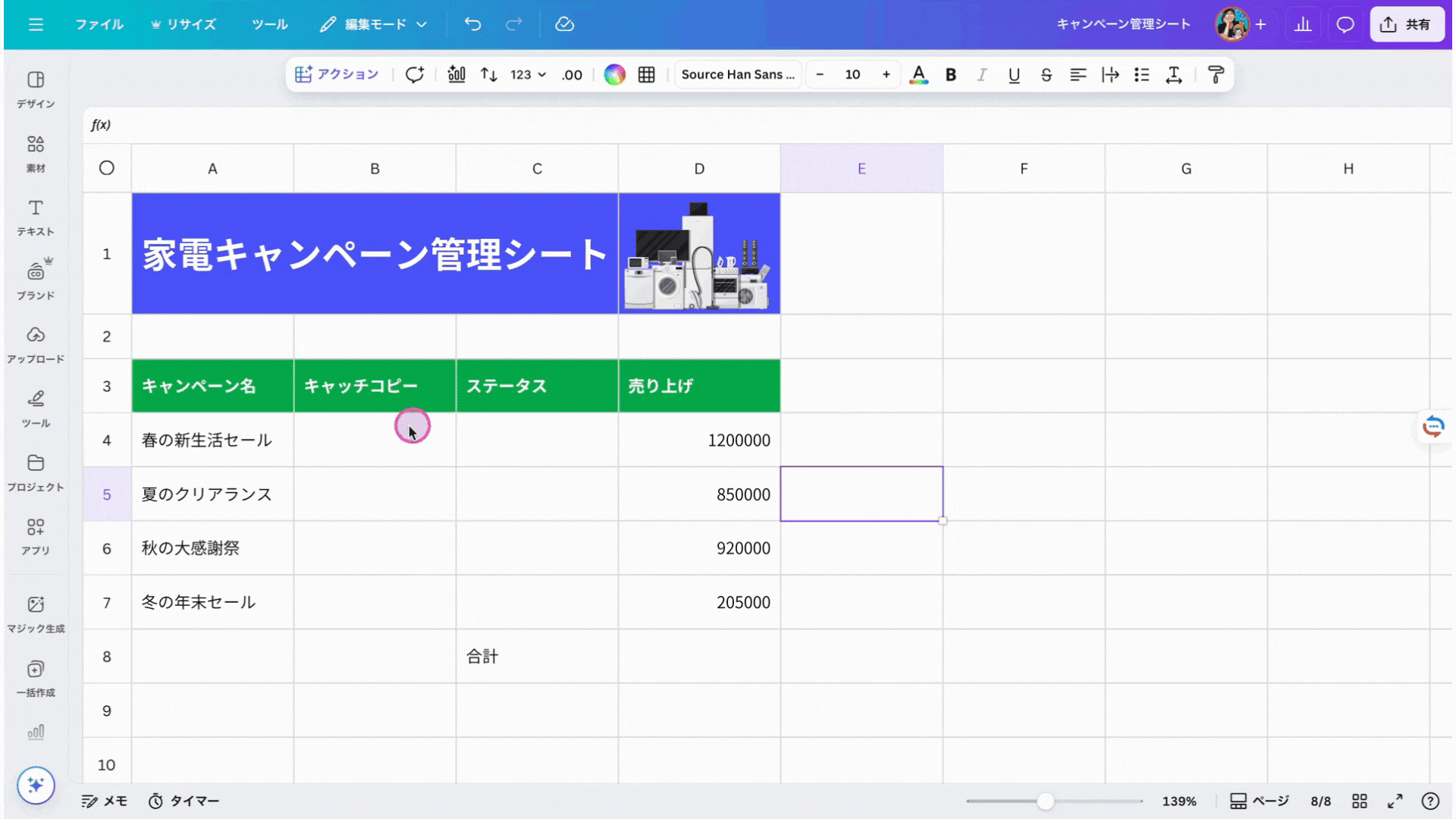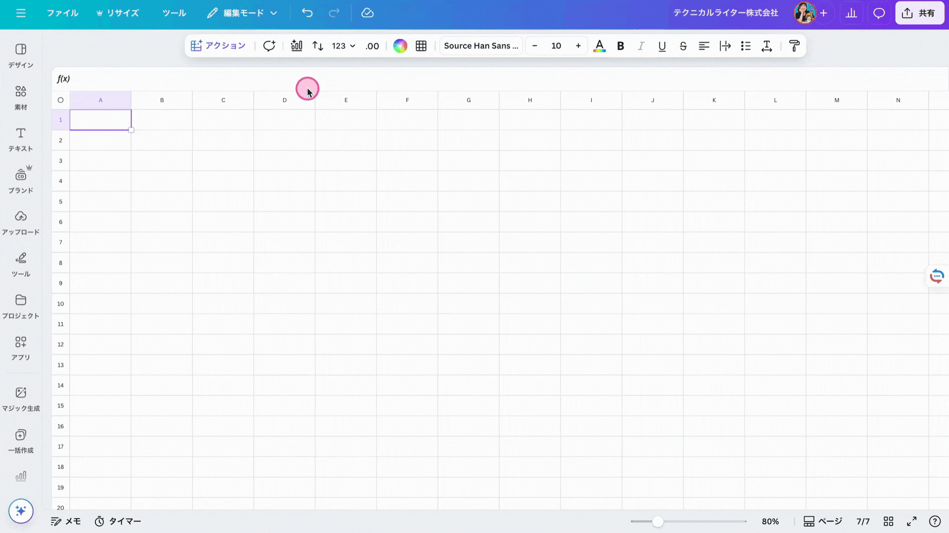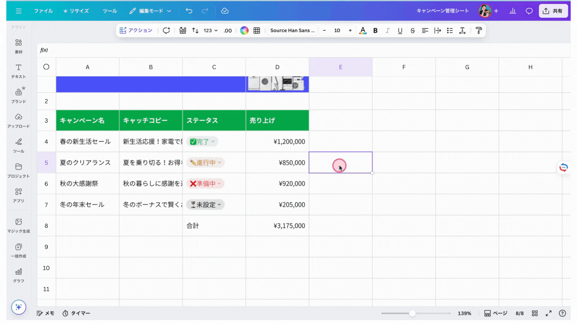 Canvaシートは、Canvaの中でExcelやスプレッドシートのように表を作成できる機能です。