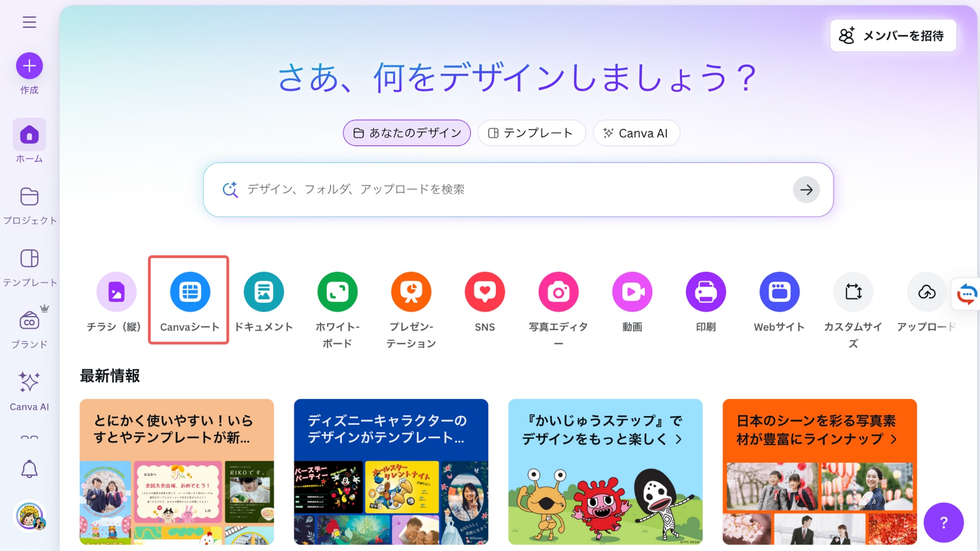 ホーム画面から [Canvaシート] のアイコンをクリックして新規作成ができます。