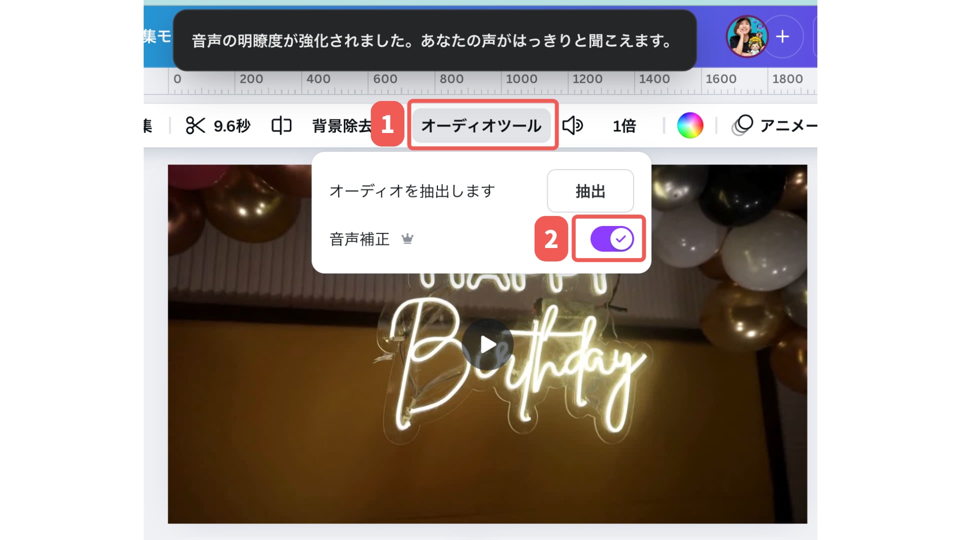 動画に雑音がある場合、ワンクリックでノイズ除去できます。