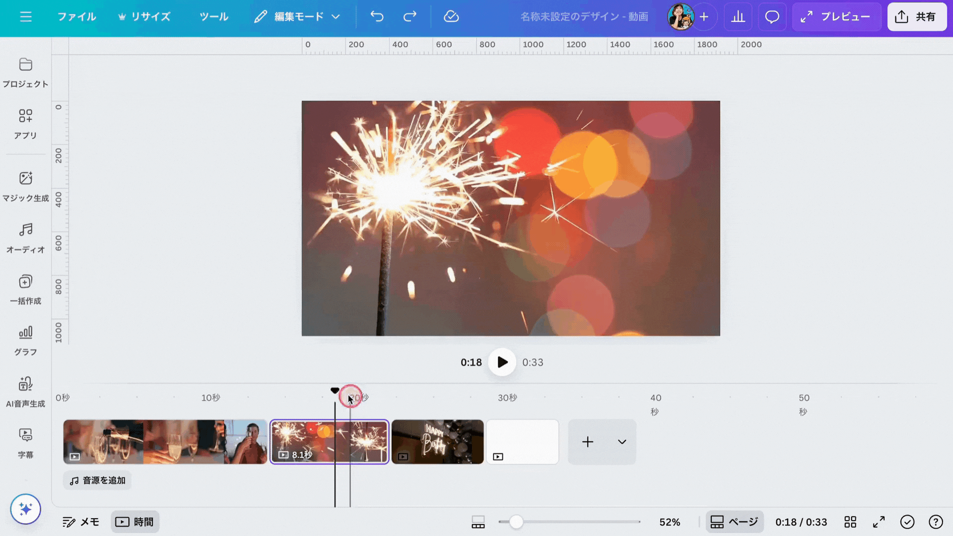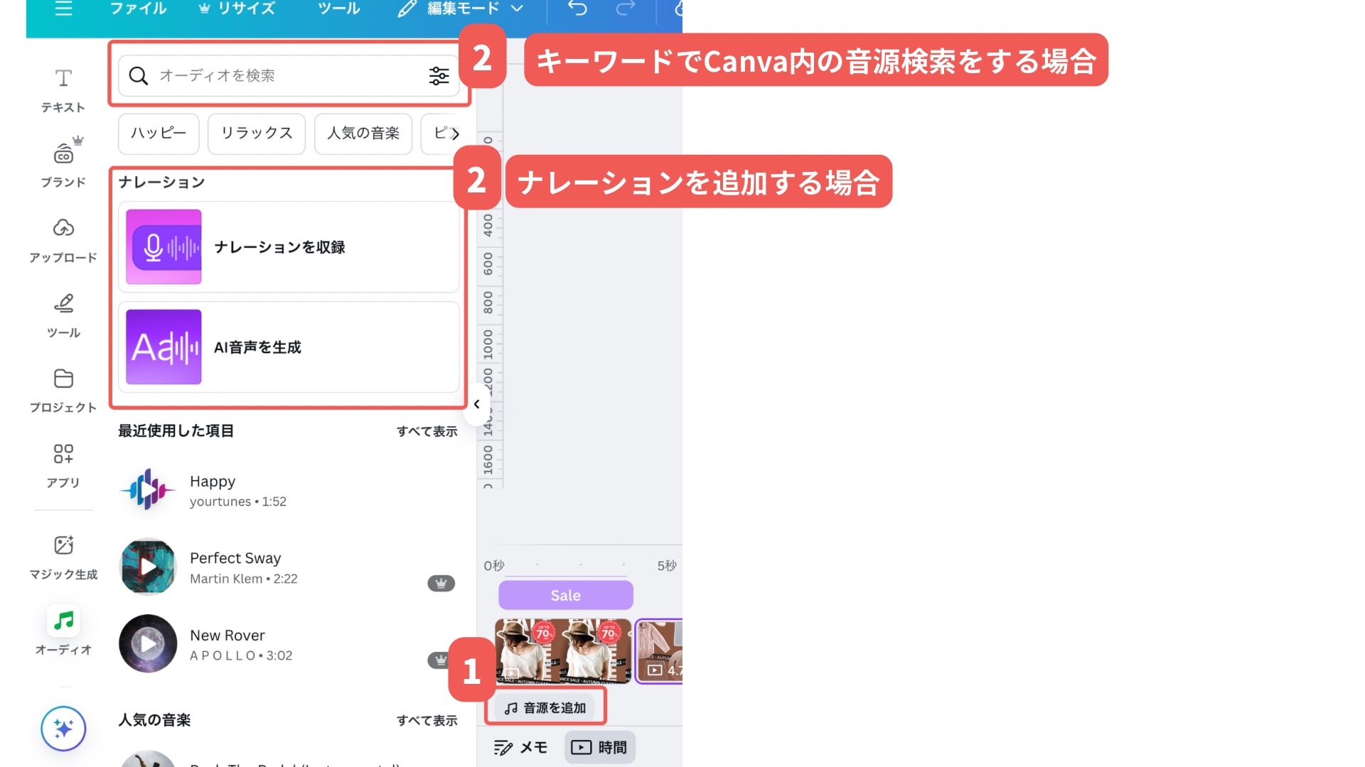 Canva内の音源から選ぶか、自分でアップロードしてBGMや効果音を入れられます。