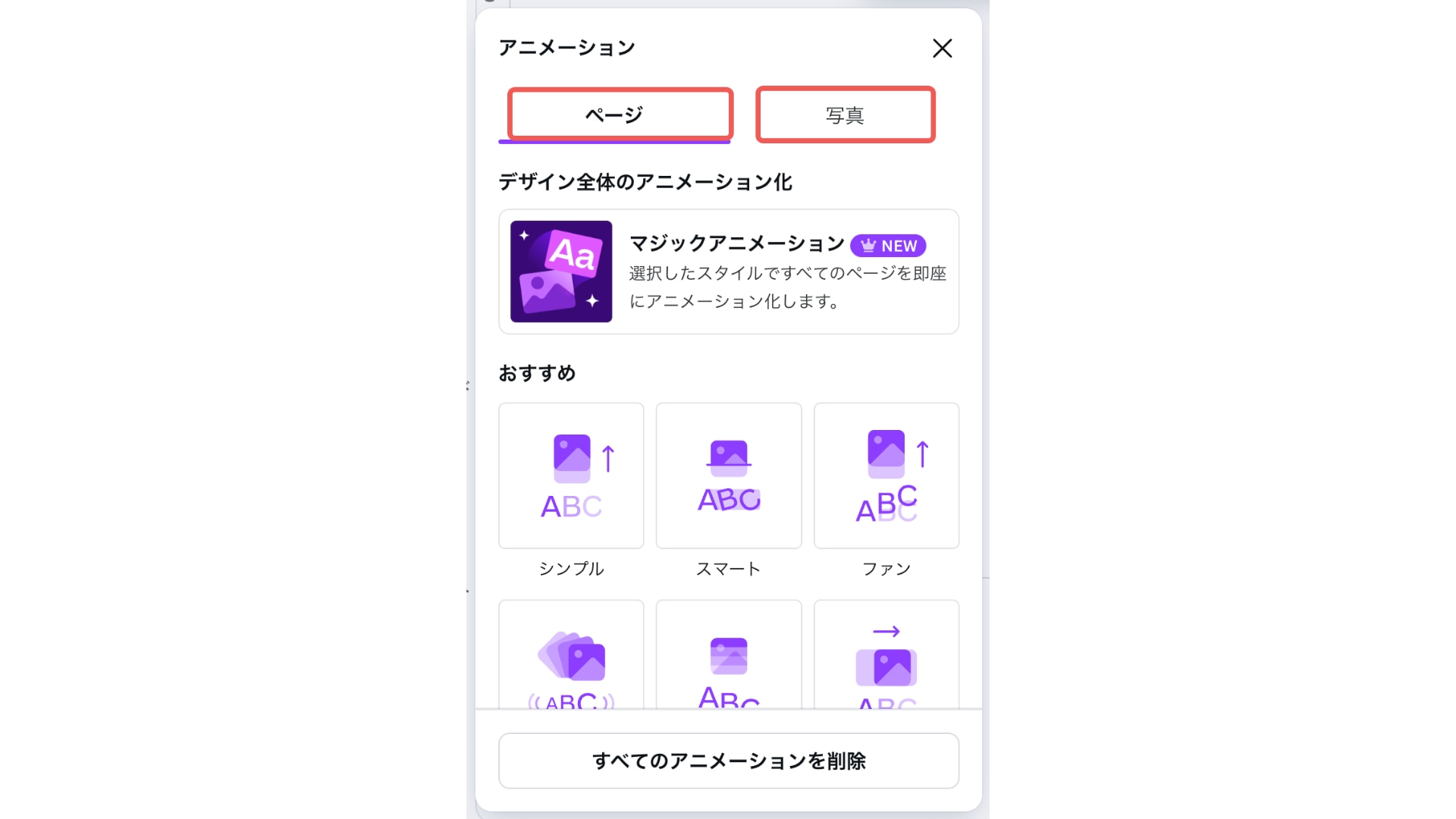 アニメーションはページ単位または素材単位で入れることができます。