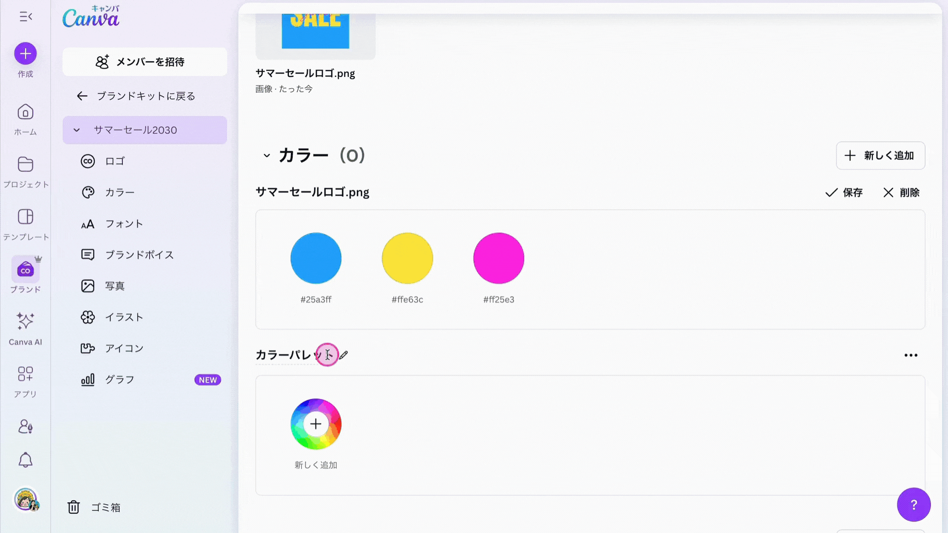 ブランド機能は有料機能ですが、無料ユーザーでもブランドキットの「カラーを3色まで」登録が可能です。