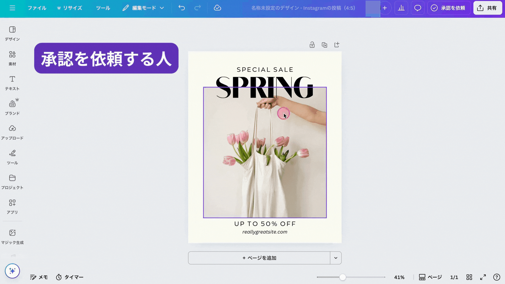 承認依頼はCanva上で可能で期限やコメントを追加できます。