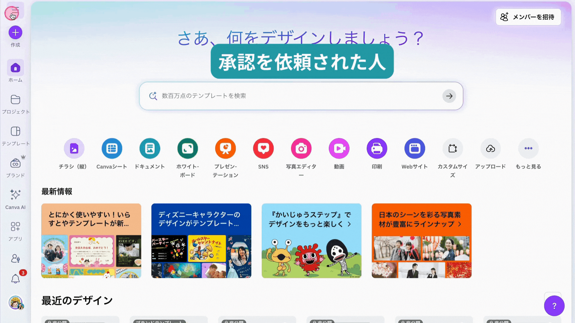 依頼をされた人はCanva上の通知で確認できます。同時にCanvaアカウントのアドレスにメールも届くので見逃しする可能性は低いでしょう。