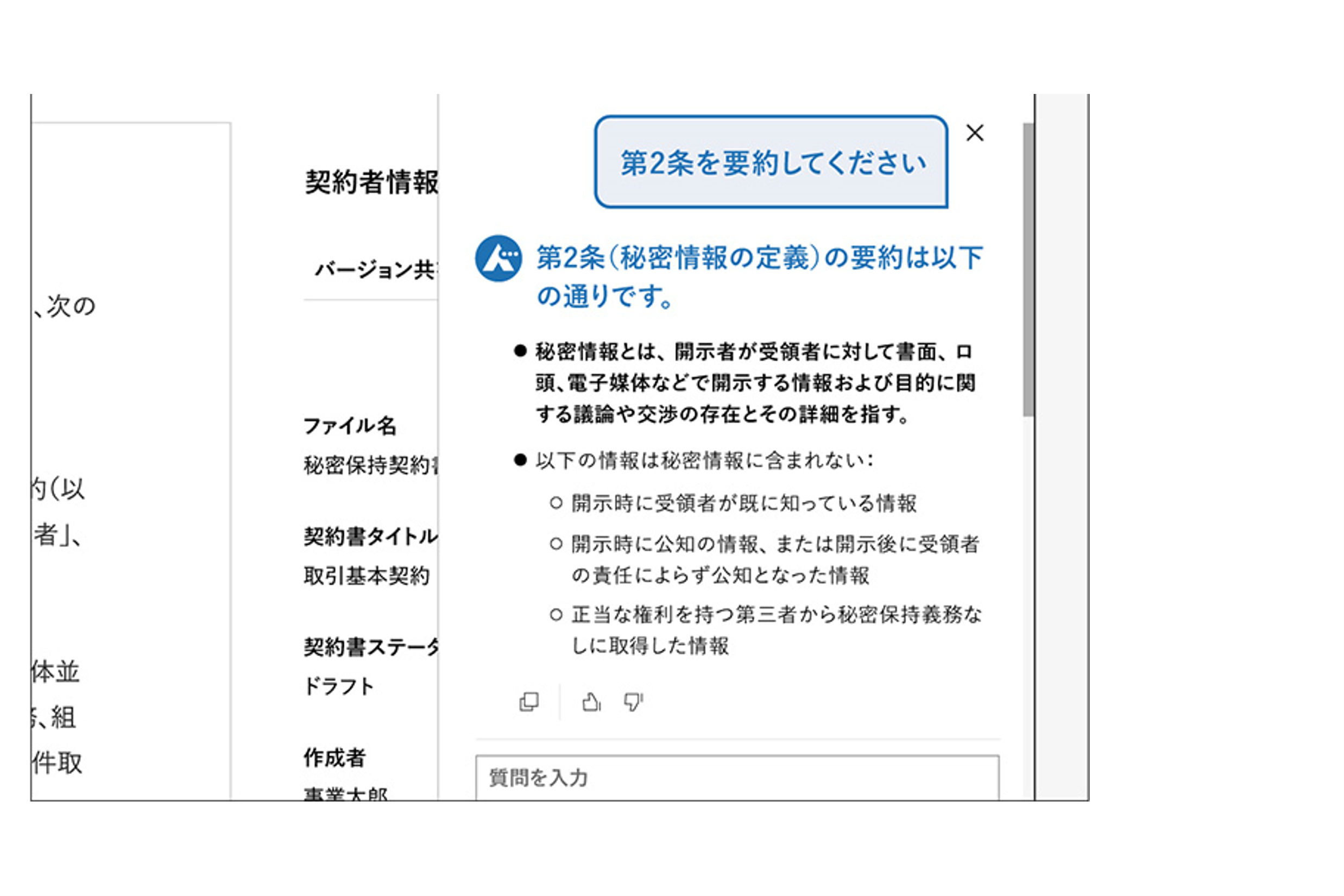 「差分の比較」、「条文修正案のドラフト」など、表示中の契約書に関して、任意の文章で質問・指示をすることで、法務AIチャットボットからの回答が得られます。