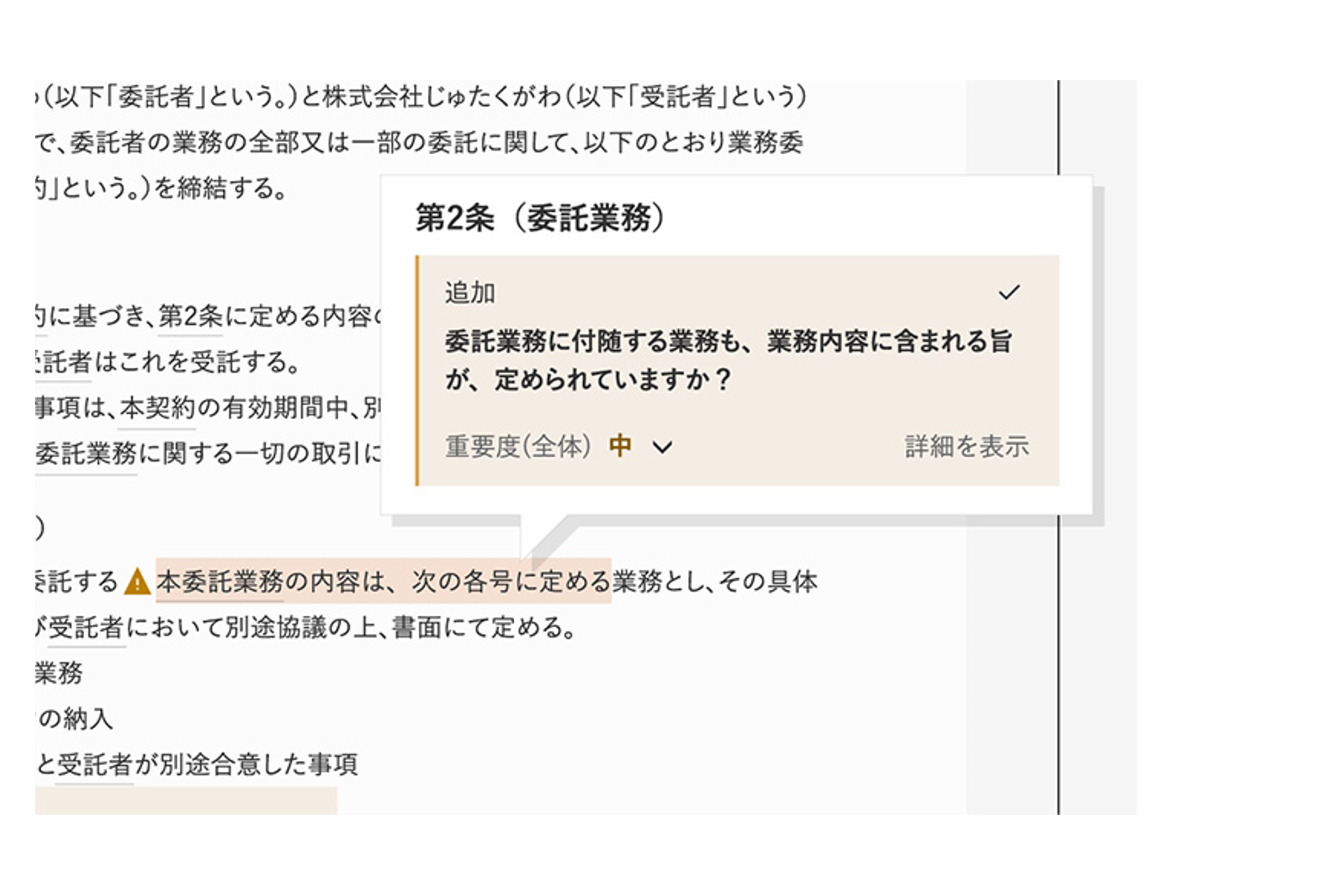 AIを活用し、瞬時に契約書に潜むリスクを洗い出し、契約書の抜け漏れを把握。修正案も提示します。