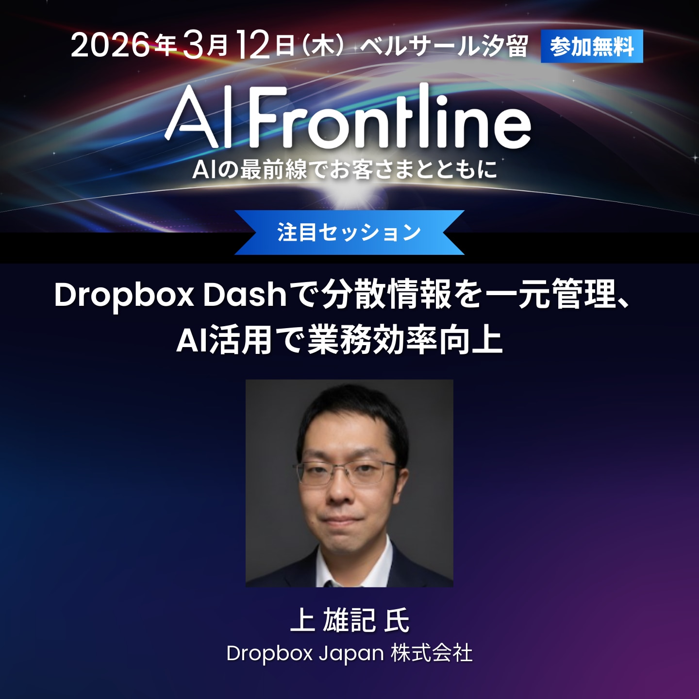 2026年に日本語版リリース予定のDropbox Dashを、会場にお越しの方だけに一足早くご紹介します。AI搭載のユニバーサル検索や情報整理機能、強力なセキュリティ機能を活用し、複数のビジネスアプリを横断して情報を素早く検索・共有・管理できる革新的なツールの全貌をぜひご覧ください。情報探しに費やす時間を削減し、本来の業務に集中できる環境づくりを体験してください。