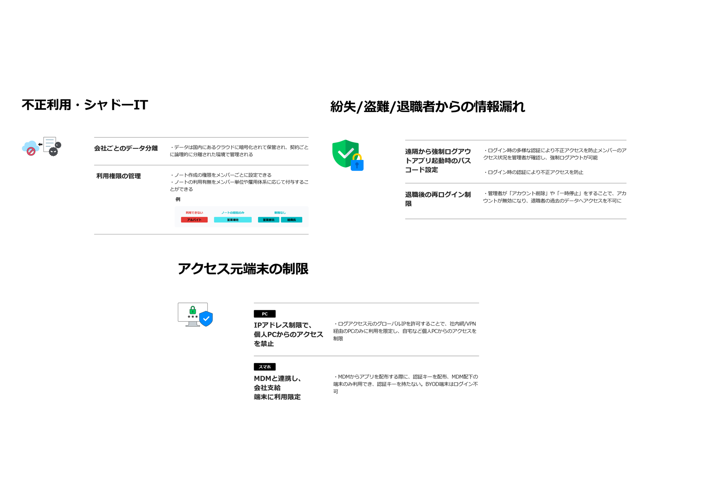 管理面では、ノートの検索/削除/機能制限、利用メンバーの管理、監査/ログなど提供しており