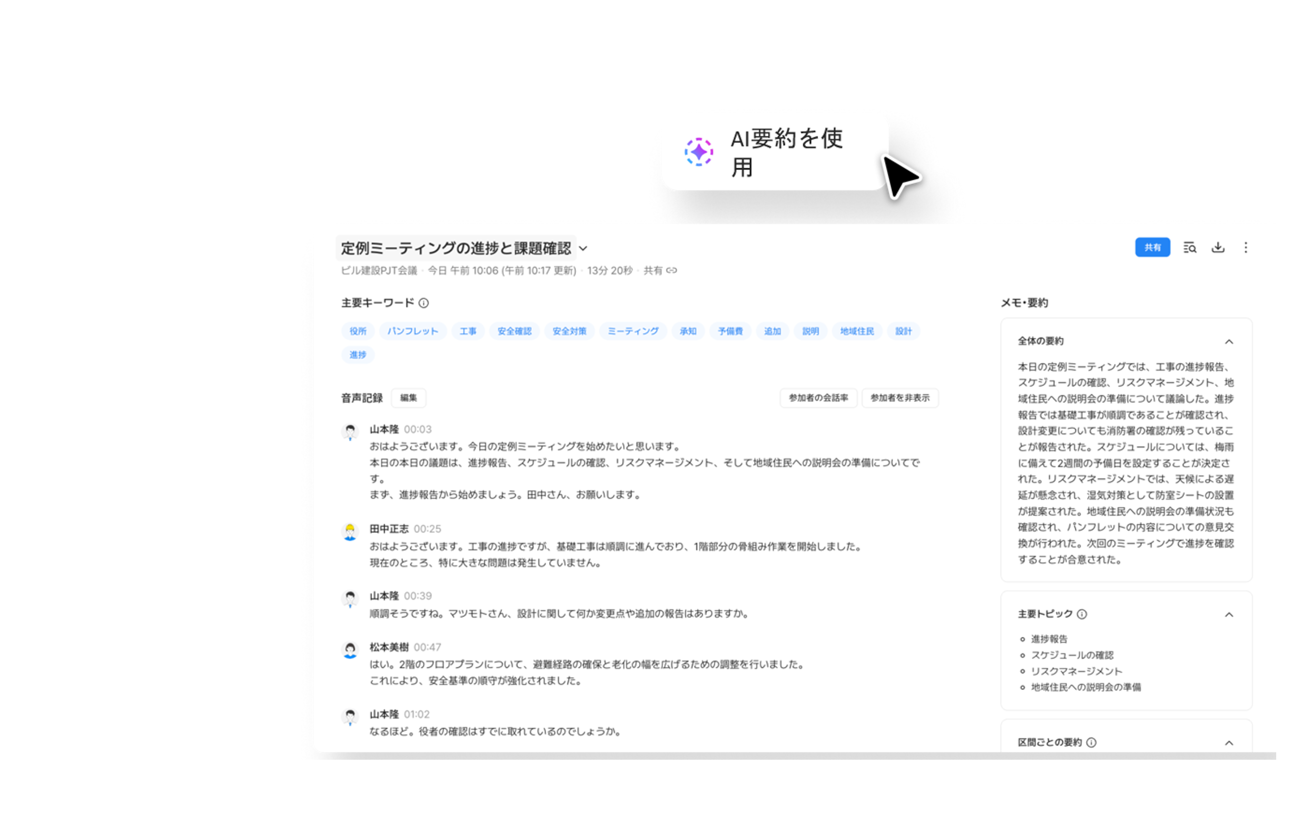 AIで会議の全体の要約や主要トピックを確認でき、区間ごとの要約を見ることができます。