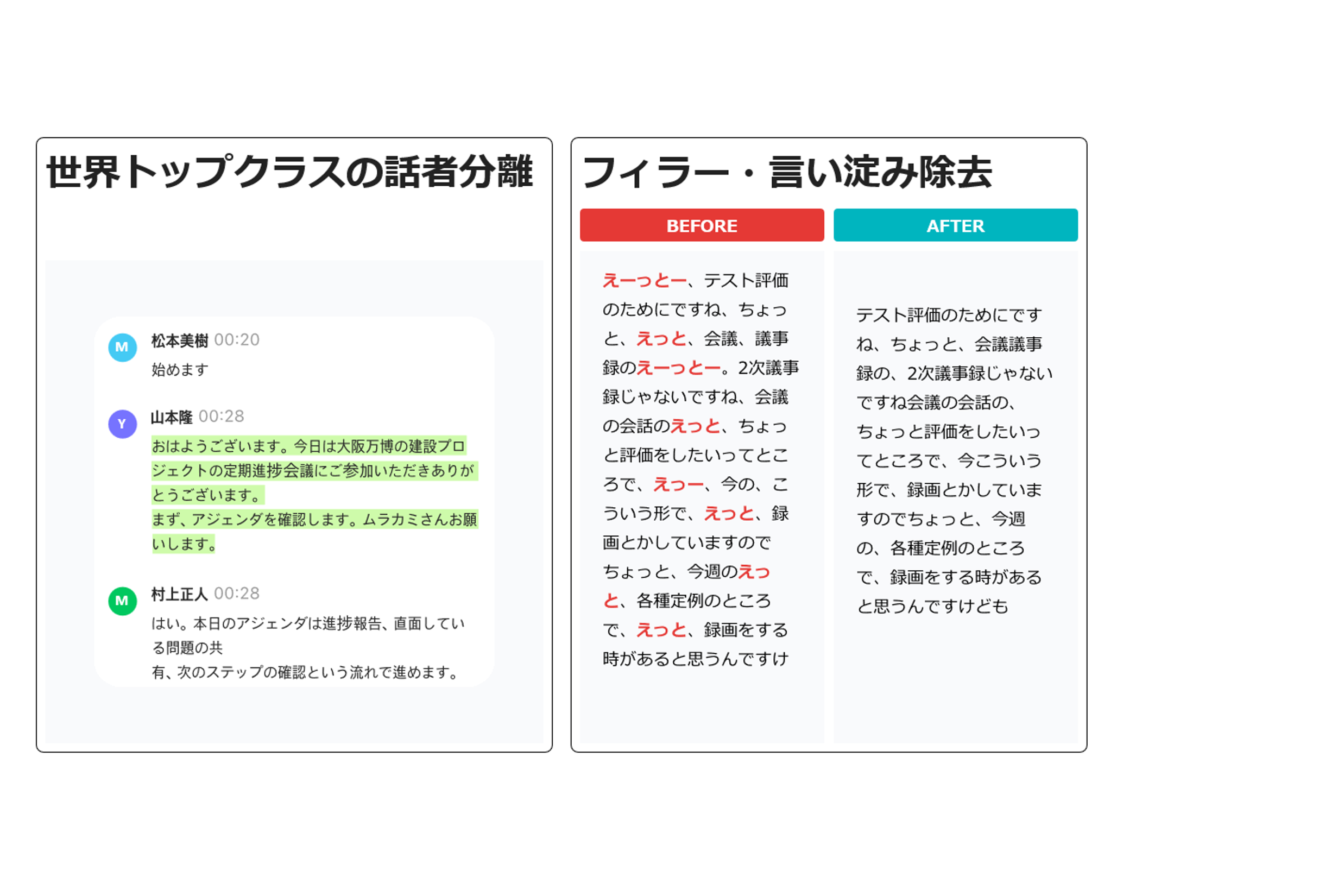 文字認識、数字認識、話者分離など発話内容を高精度に文字お越しを実現